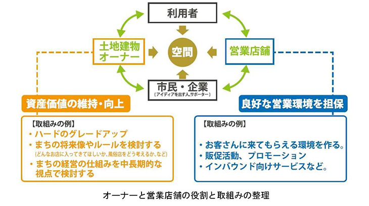 中長期的な視点で資産価値の維持・向上させることを目的として、オーナー同士で話し合う場を設け、テナント誘致や看板のマネジメントなどまちの環境を維持するためのルールについて考えていくことが求められます。